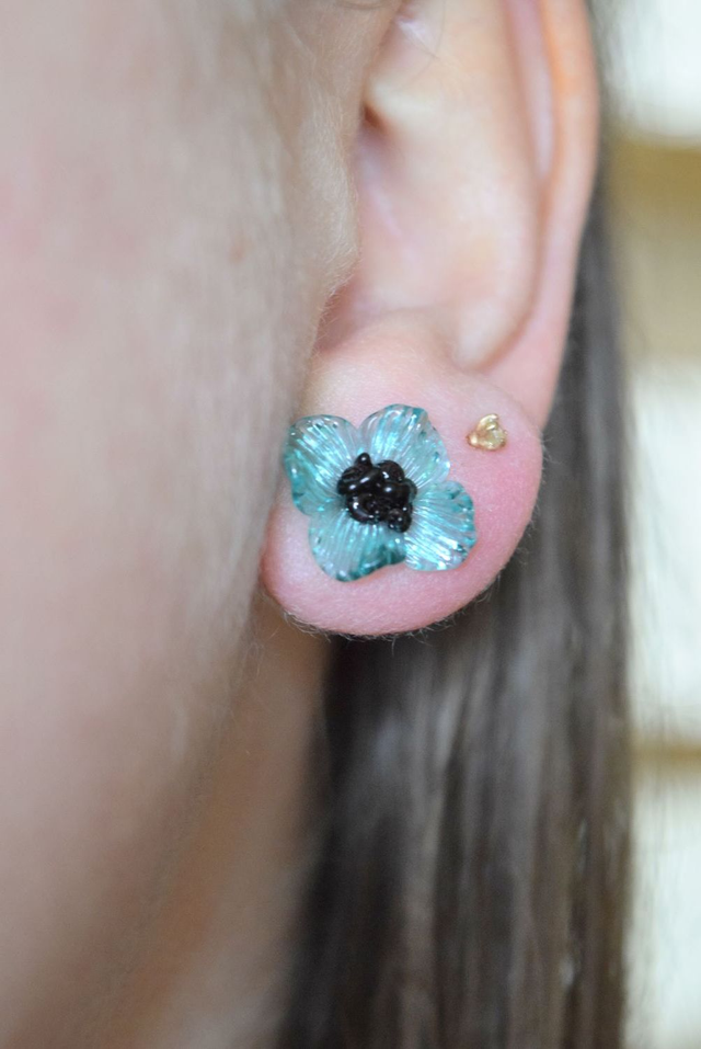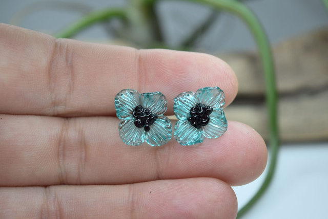 PUCES FLEURS TURQUOISE TRANSLUCIDE MONTURE INOX GRIS (PF11)
