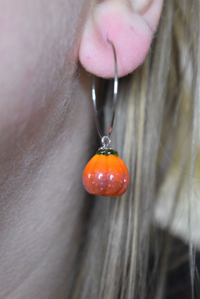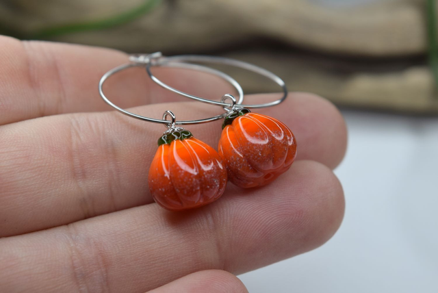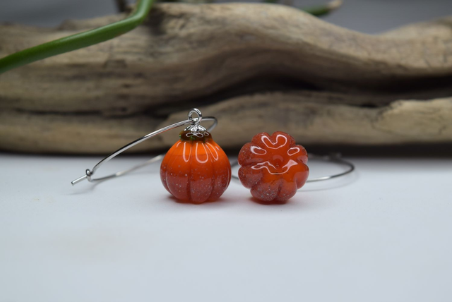 Verre de Murano, base transparente recouvert de orange. Verre parsemer de poudre pour un effet « vieille citrouille », le tout fais à la main (sculpture au couteau) sous la flamme d'un chalumeau perlier.