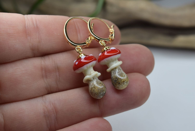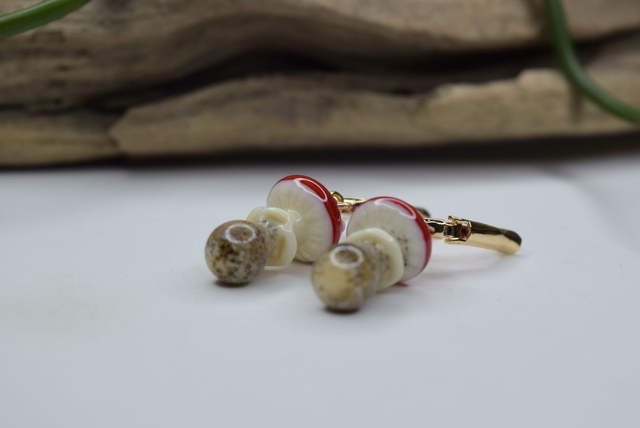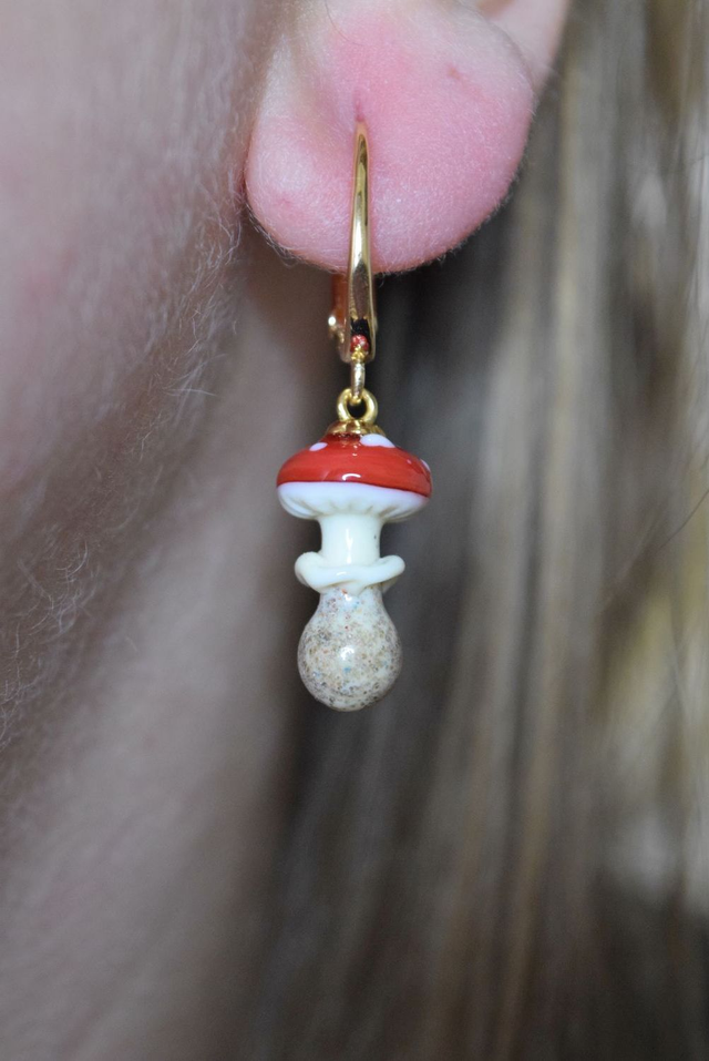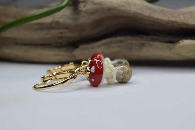 Verre de Murano, base de couleur ivoire, chapeau rouge aux points blanc. Verre parsemer de poudre pour un effet « terreux », le tout fais à la main sous la flamme d'un chalumeau perlier.
