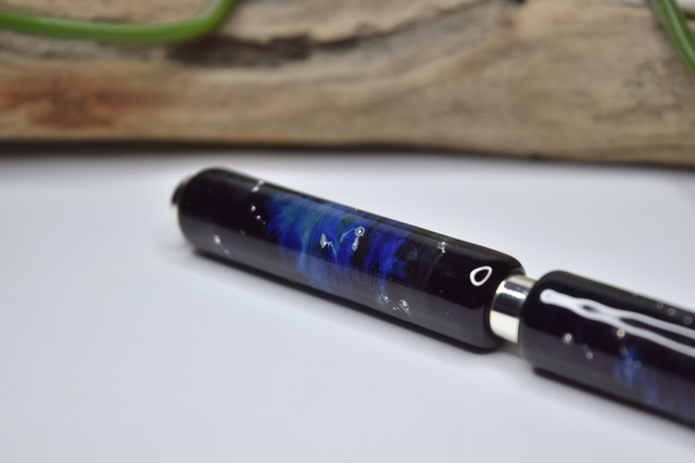 Mine noire celée d'une gomme (qui évite le dessèchement de l'encre), mine remplaçable.